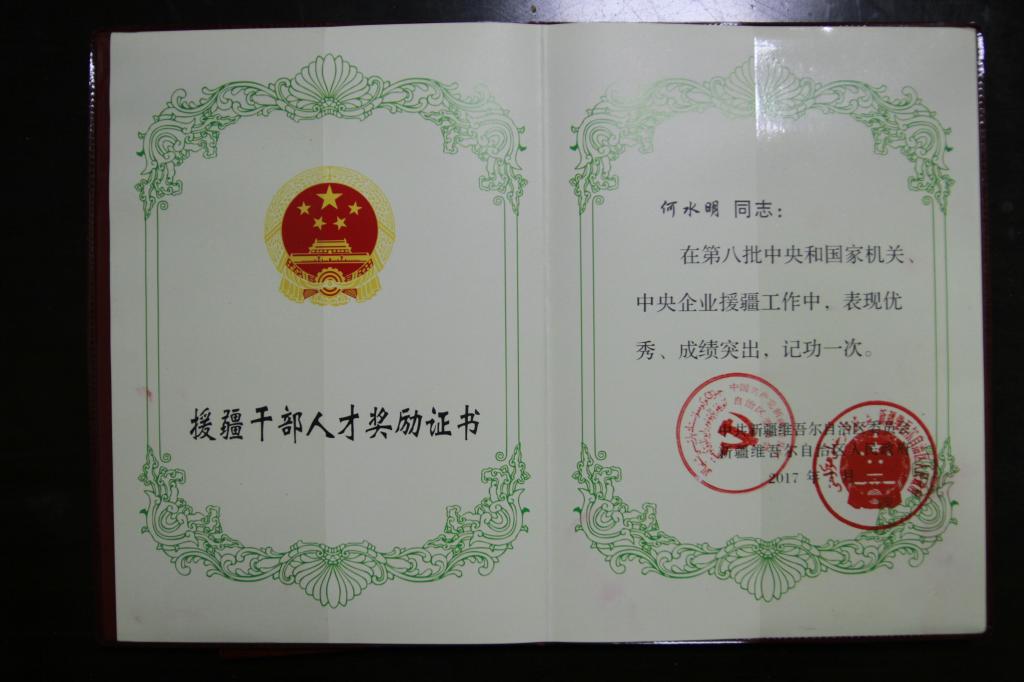 近日获悉,色小说 何水明同志被新疆自治区党委和政府评为“第八批中央和国家机关、中央企业优秀援疆干部人才”,并授予奖牌和奖章。