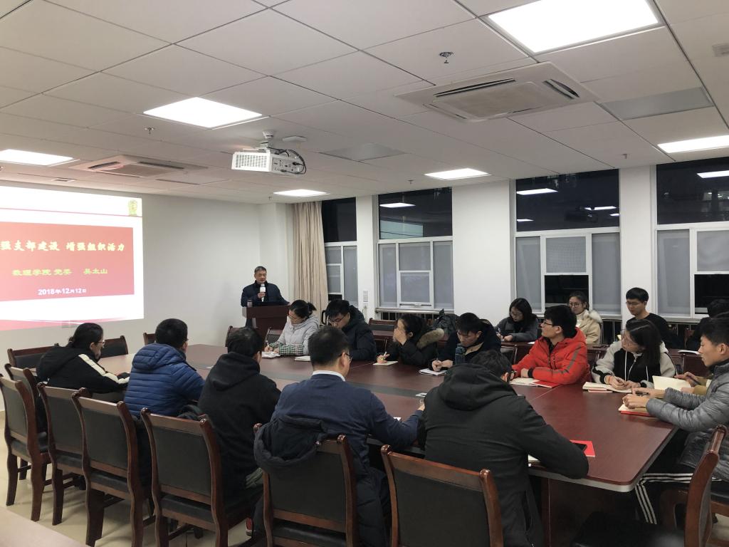12月12日晚,色小说 学生党支部书记、支委培训会在教学综合楼A1505会议室召开。院党委书记吴太山主讲,学工组全体辅导员参加培训会,黄恬恬主持。