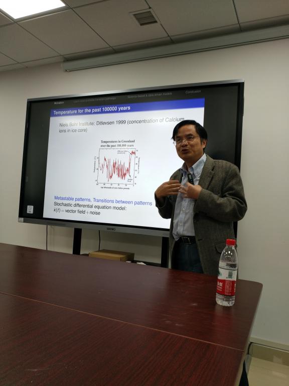 作为中国地质大学校庆67周年学术交流周名家论坛嘉宾同时作为“数理论坛”第114期嘉宾,段金桥教授做了一场“数据科学碰上动力系统:我们可以学到什么?”的精彩报告。段金桥教授首先从基因随机表达的现象和数据出发进入主题,然后介绍了大气科学以及全球温度变化的模式和数据,进一步引出了随机微分方程及其在地球科学问题中的应用,特别针对非高斯噪声体系,结合一个双稳态模型详细阐述了如何从数据出发进行模型的学习和优化,并寻找最大可能迁移轨道。段金桥教授的报告将数据科学和不确定性及非线性动力系统问题紧密联系在一起,并总结了若干地球科学、生命科学问题研究中的数学挑战。报告加深了大家对于应用数学的认识,启发了听众对于数据科学新的思考。