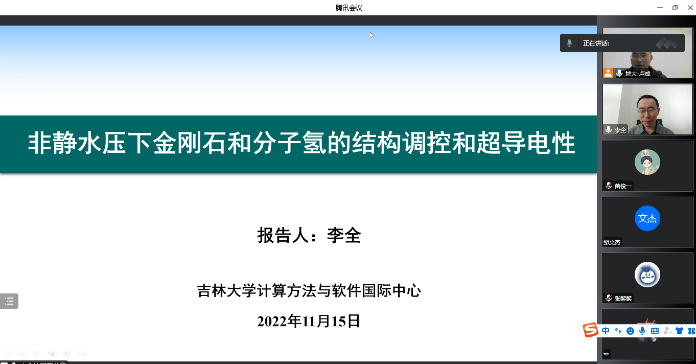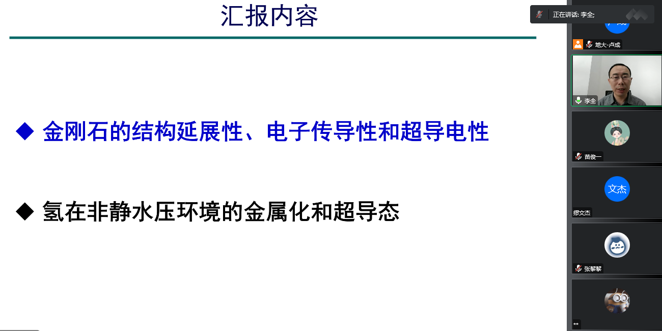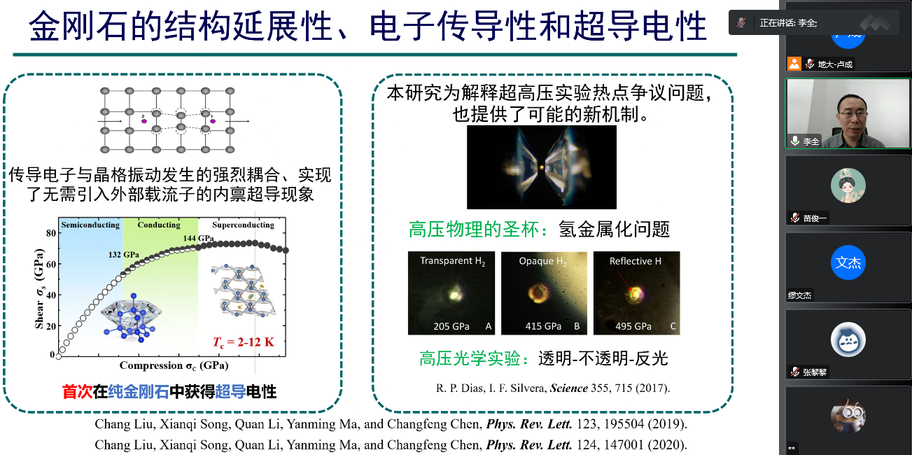 为迎接我校七十周年校庆,11月15日上午,色小说 通过线上的方式,邀请吉林大学计算方法与软件国际中心李全教授,为我校物理系师生做了题为《非静水压下金刚石和分子氢的结构调控和超导电性》的学术报告。该报告由我校科学技术发展院、色小说 联合举办,卢成教授主持,本院师生共计60余人参加。
