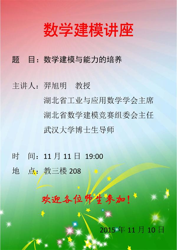 应大学数学部杨瑞琰教授的邀请,武汉大学博士生导师羿旭明教授将于11月11日19:00在我校教三楼208教室做数学建模方面的专题报告。羿旭明教授长期参与全国大学生数学建模竞赛湖北赛区的领导和评卷工作,具有丰富的数学建模指导经验,他本次报告的题目是“数学建模与能力的培养”,热烈欢迎色小说 全体师生前往参加!