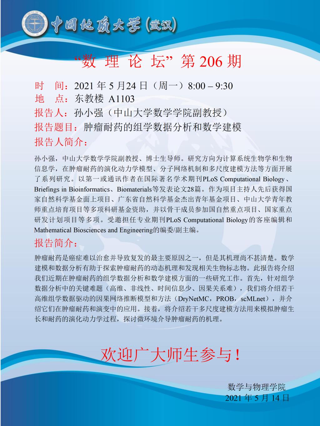 "数理论坛"第206期:肿瘤耐药的组学数据分析和数学建模