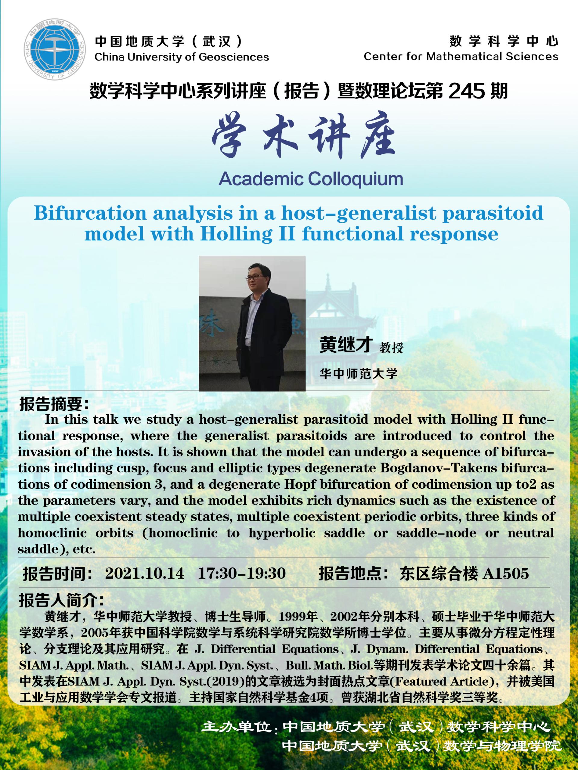"数理论坛"第245期暨数学科学中心系列讲座(报告):Bifurcation analysis in a host-generalist parasitoid model with Holling II functional response