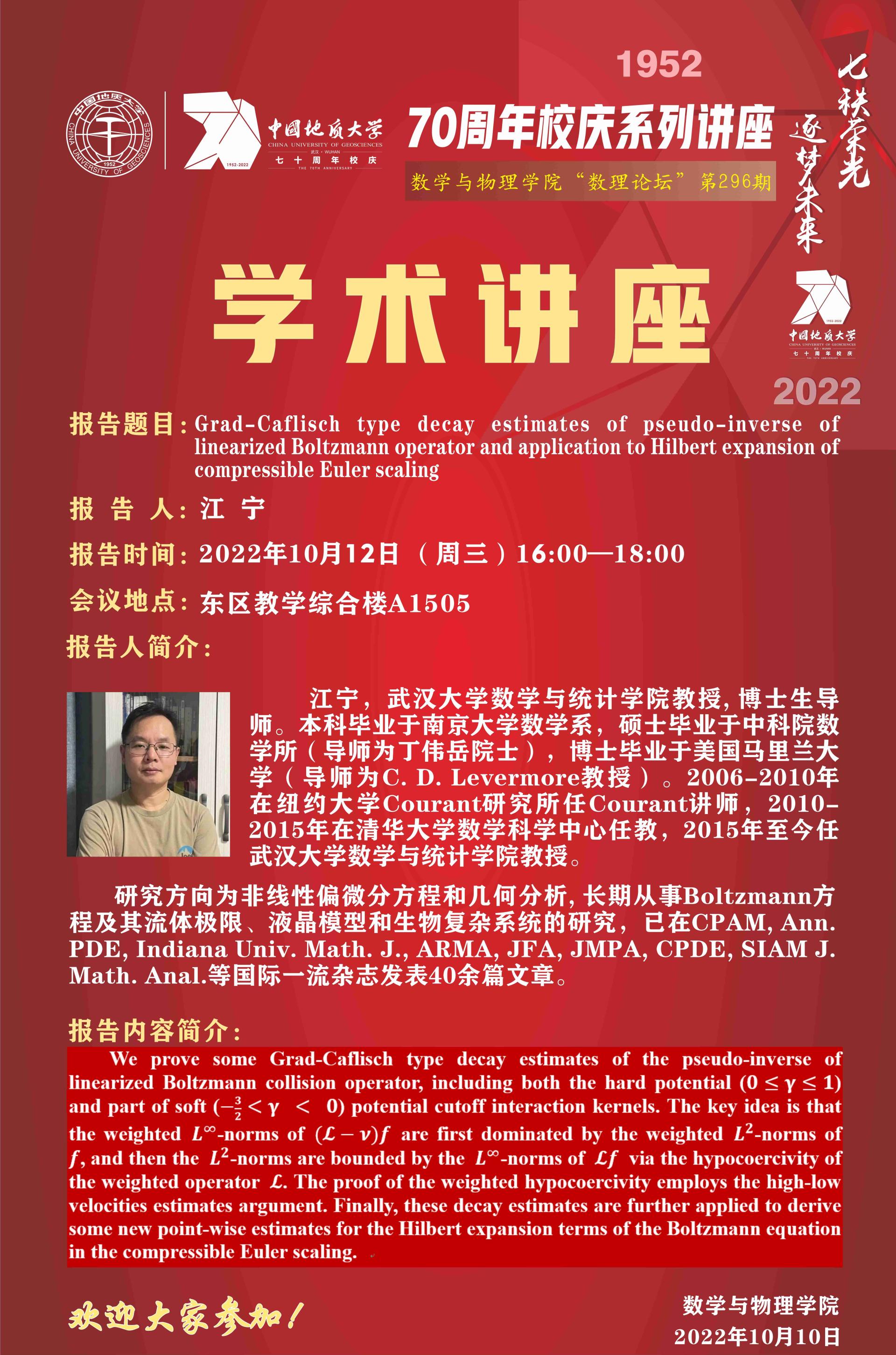 "数理论坛"第296期:Grad-Caflisch type decay estimates of pseudo-inverse of linearized Boltzmann operator and application to Hilbert expansion of compressible Euler scaling