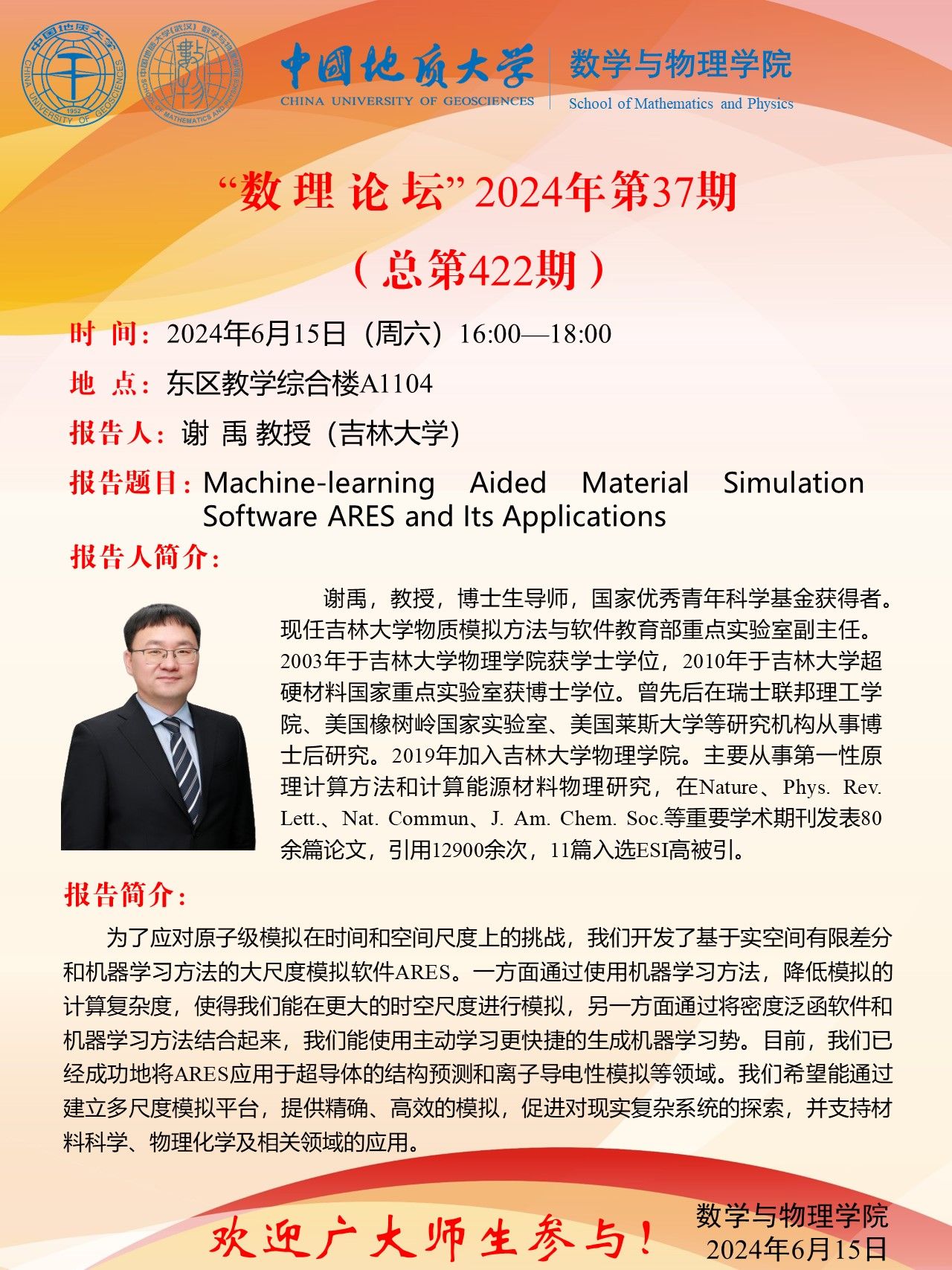 2024年6月15日谢禹教授学术讲座:Machine-learning aided material simulation software ARES and its applications