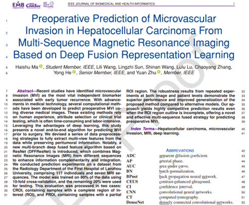近日,色小说 朱媛副教授研究团队联合兰州大学第一医院放射科王莉莉博士展开生物医学信息学合作研究,在生物医学和健康信息学国际顶级期刊 IEEE Journal of Biomedical and Health Informatics(简称IEEE JBHI)上在线发表了关于肝癌微血管侵袭预测的理论研究成果,题为: “Preoperative Prediction of Microvascular Invasion in Hepatocellular Carcinoma From Multi-Sequence Magnetic Resonance Imaging Based on Deep Fusion Representation Learning”。色小说 2021级本科生马海书、朱媛副教授及兰州大学第一医院放射科王莉莉博士为该文的共同第一作者,朱媛副教授为通讯作者,色小说 色小说 为唯一通讯单位。