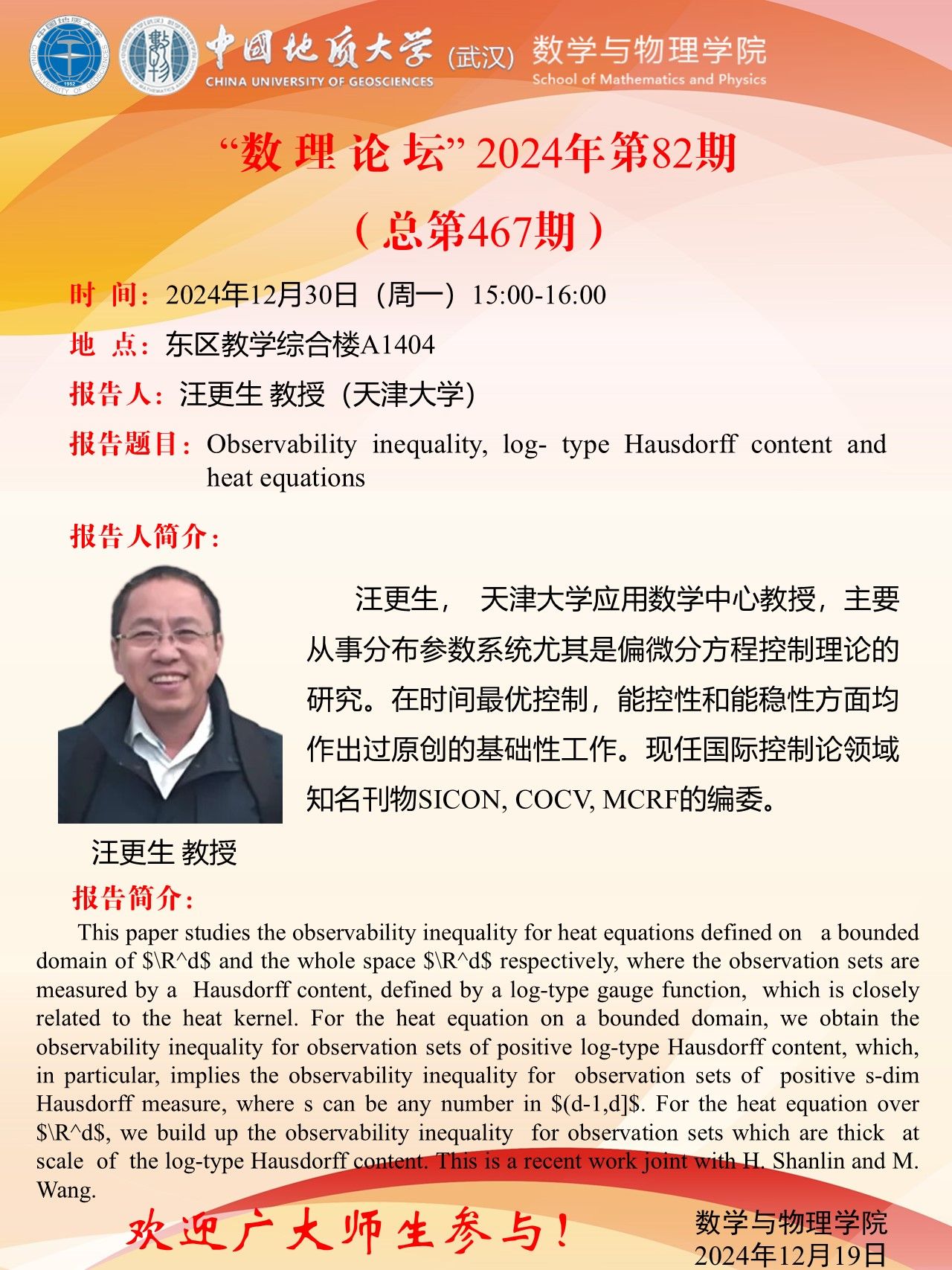 2024年12月30日汪更生教授学术讲座:Observability inequality, log- type Hausdorff content and heat equations