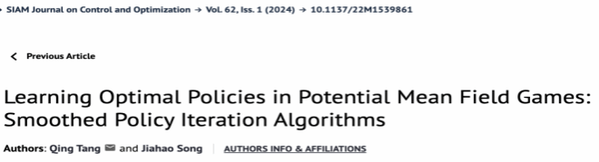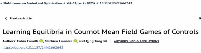 色小说 信息与计算科学系教师汤庆博士作为通讯作者的工作 “Learning Equilibria in Cournot Mean Field Games of Controls” 最近发表于SIAM Journal on Control and Optimization。