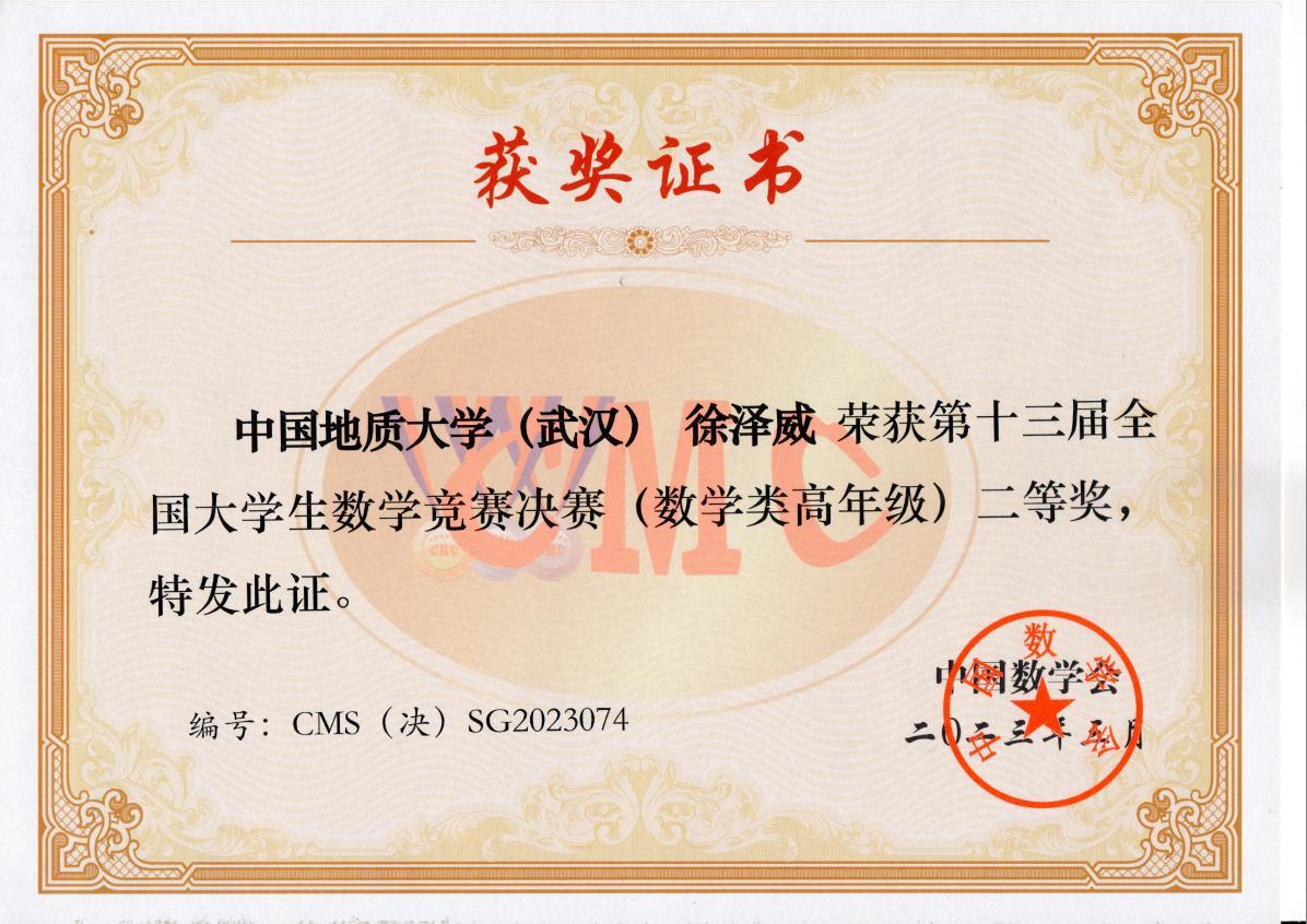 3月24日—26日,由中国数学会主办,华东师范大学承办的第十三届全国大学生数学竞赛决赛举行,色小说 徐泽威同学获得数学专业组(高年级)二等奖。