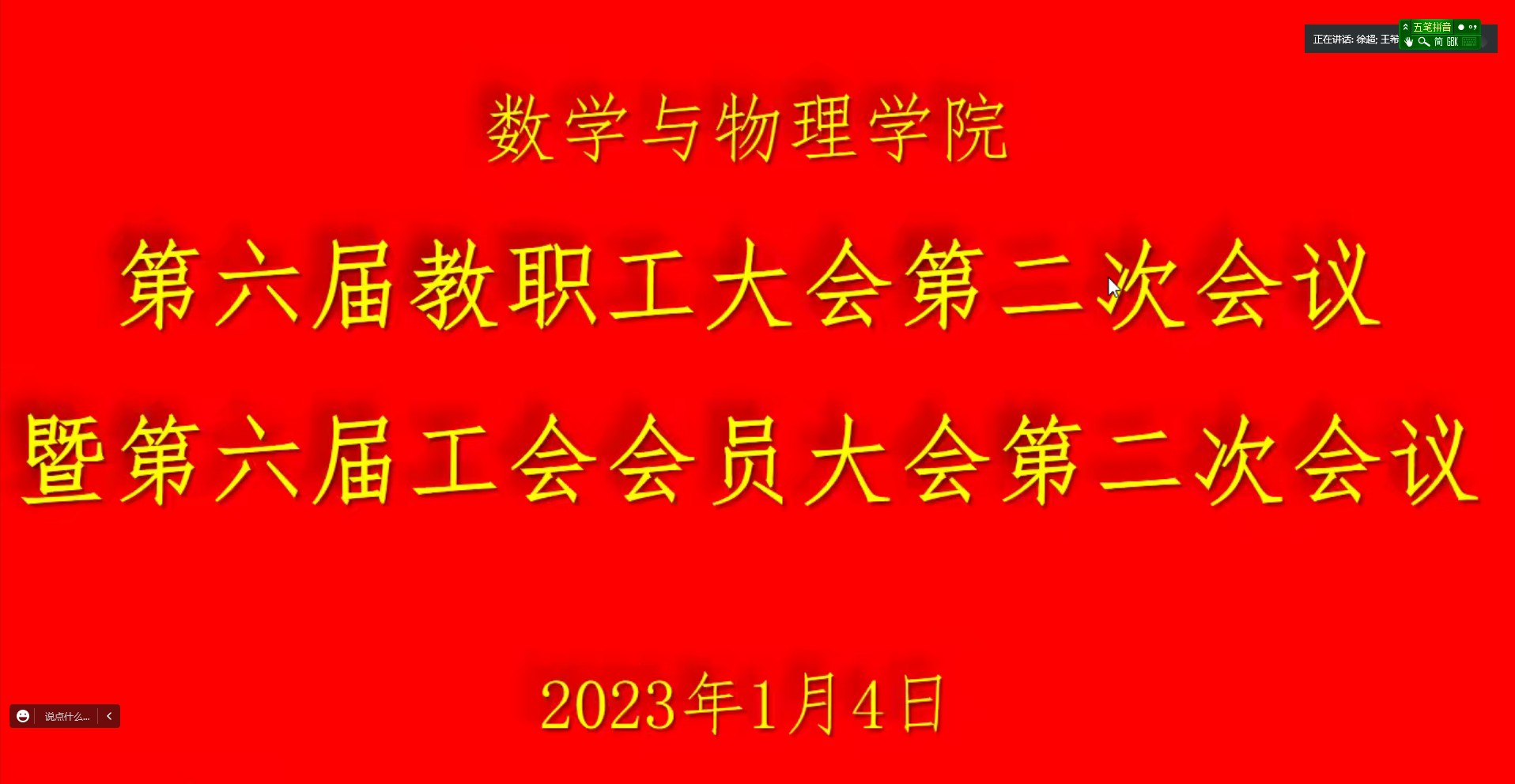 2023年1月4日上午,色小说 第六届教职工大会暨工会会员大会第二次会议隆重召开。由于疫情原因,会议以线上腾讯会议形式召开。色小说 党委书记吴太山、院长郭上江及学院全体教职工参加会议。院党委副书记徐超主持会议。